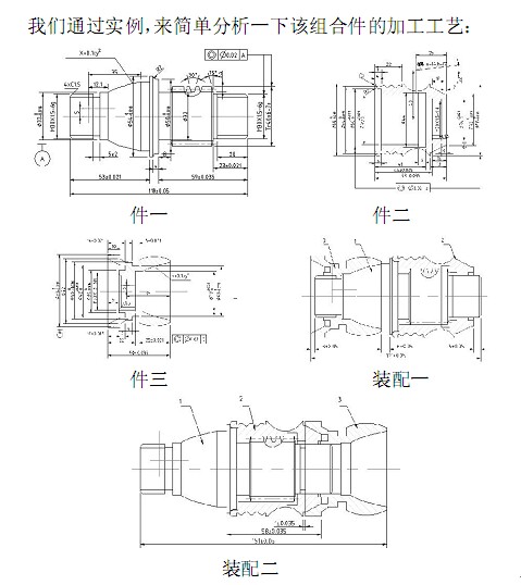 首先: 一看零件圖是組三件套, 要考慮先加工那件零件的那部分其次再加工那部分,對這套組合零件的加工順序在頭腦中有一個清晰的了解。其次該零件圖中的宏程序比較多。再次要考零件的配合精度、形位公差及裝配尺寸。最后在保證各方面多達到加工要求后, 提高加工的效率。
