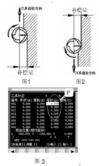 在編程時,使用非零的D##代碼( DO1-D32)選擇正確的刀具偏置寄存器寫,其偏置m:(即補償值放在如圖3相對應(yīng)f的位置)的大小通過CRT/MDl操作而板在對應(yīng)的偏置寄存器寫中設(shè)定、在粗加下時,將補償伯設(shè)為D-R+O,其中R為刀具的半徑,△為精加下余m:,這樣在粗加下完成后,形成的下件輪廓加下尺寸理論上要比實際輪 廓每邊都大△、在精加下時,通 圖3過測m:伯設(shè)定補償值,這樣,零件加下完成后,即可得到實際加下輪廓,如圖3所示、