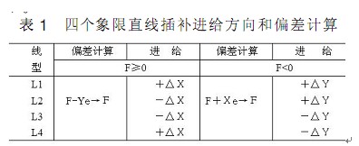 與前面進行比較后發現 當被插補直線處于不同象限時 其計算公式及處理過程完全一樣 僅僅是進給方向不同而已 進一步可總結出 L1 L2 L3 L4 的進給方向如圖 6 和表 1 所示
