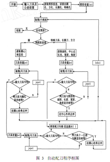 利用循環原理 ,把實體數組中的圖素全部處理后 ,在 CAM層上就自動把合適的刀具適配上了 , CAM圖形為了區別于 CAD圖形 ,以特殊的顏色顯示 ,放在專用層上 ,以便于后續處理。由于篇幅所限 ,在這里只能給出程序框圖圖 3。
