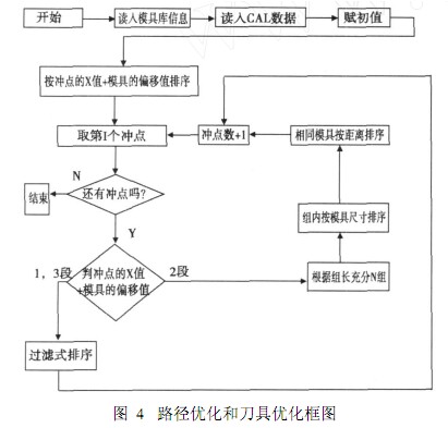 該優化方法采用分組方式 ,每兩米為一組 ,每組內先按模具優化 ,相同模具按沖點的 X值 +所用模具的偏移值的距離進行優化 ,相同模具并且 X值 +所用模具的偏移值也相同的沖點按 Y值+所用模具的偏移值的距離進行比較 ,再按所有優化路徑進行比較 ,選出一個最佳路徑生成 NC代碼。
