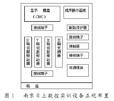 以上類型,各有優(yōu)缺點(diǎn),使用時(shí)都有不盡人意的地方,說明對系統(tǒng)進(jìn)行優(yōu)化的一些方案。該系統(tǒng)采用的是華中世紀(jì)星數(shù)控裝置,屬于基本型,其數(shù)控系統(tǒng)的前視圖見圖1。從圖可以看出,其實(shí)質(zhì)是將一臺(tái)實(shí)際數(shù)控機(jī)床的控制部分展開了,因采用了工程中應(yīng)用的元件,較真實(shí)的體現(xiàn)了實(shí)際應(yīng)用,但是在實(shí)際教學(xué)中,該系統(tǒng)的主要問題有:故障設(shè)置麻煩,經(jīng)常的拆卸端子,使端子的螺絲損毀,另外,用電纜連接的各種信號(hào)線根本無法測量,也無法設(shè)故障等問題,在應(yīng)用中,我們進(jìn)行了一些優(yōu)化工作,使得更好的適合于教學(xué)。