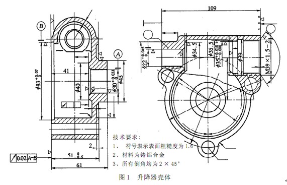 首先根據(jù)設(shè)計圖紙, 鑄造加工具有一定精度的升降器殼體半成品零件。