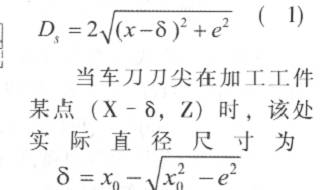 數控車削零件之前, 通常先對刀確定工件坐標系原點在機床坐標系中的位置, 一般采用試切法。具體做法: 首先在零件端部試切一小段直徑為 2X0 的圓柱( 如圖 2) , 然后根據測量值, 就可確定工件坐標系原點在機床坐標系中 X向的位置。此時若刀尖與工件回轉中心線等高, 則對刀后確定的工件坐標系原點應在工件回轉中心線上, 但實際安裝時, 如果刀尖存在高度偏差 e, 則試切對刀后, 得到的工件坐標系原點相對工件回轉中心線在 X 向向內偏離 δ(如圖 3)。此種情況下若零件某截面直徑尺寸為2X0, 車削時為保證該段尺寸符合要求, 那么車刀刀尖在 X 軸上的實際坐標為 X0–δ 。若在任一軸向位置時, 工件要求加工的直徑尺寸為 2X, 則車刀刀尖 X 向實際坐標為 X–δ , 根據以上分析有: