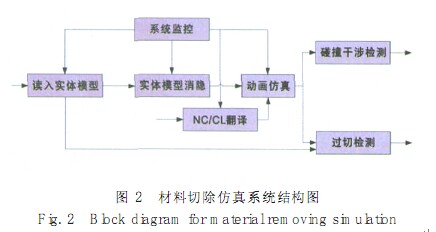 對(duì)于材料切除過(guò)程仿真, 國(guó)內(nèi)外也有一些研究成果, 主要集中在相應(yīng)的算法方面。 如基于 Z- map 結(jié)構(gòu)的算法[11]、 基于 Dexel 模型的快速成型算法[12], 等等。總的來(lái)說(shuō), 材料切除過(guò)程的仿真主要有兩個(gè)功能: 一是檢測(cè)是否過(guò)切、 干涉、 碰撞, 以檢測(cè) NC代碼和刀位文件的正確性; 二是通過(guò)逼真的三維動(dòng)畫(huà)來(lái)實(shí)現(xiàn)可視化仿真, 為虛擬制造提供支撐環(huán)境。圖 2 為一個(gè)典型的材料切除仿真子系統(tǒng)的功能結(jié)構(gòu)圖。