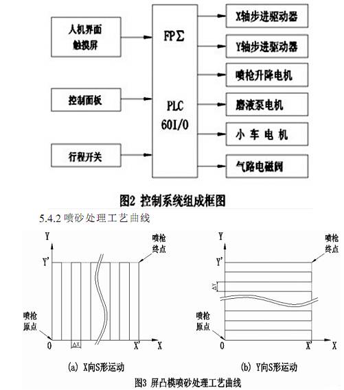 執行自動控制程序時 工件放在小車上后 按 運行 按鈕 小車啟動和工件一起運行到工作艙內停在加工位置 同時艙門關閉 此時磨液泵啟動 氣路電磁閥打開 噴槍按照觸摸屏上設定的工藝曲線在步進電機的驅動下進行噴砂處理 當噴槍走完工藝曲線回到原點時 磨液泵停止工作 壓縮空氣關閉 小車啟動將工件運出工作艙 完成工件加工