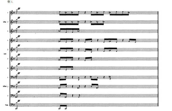 在作品的第一大部分中, 作者不但在音色上采用了數(shù)控的因素, 而且在每個(gè)樂(lè)句進(jìn)入時(shí)也都采用了嚴(yán)格的數(shù)控手法, 第一樂(lè)段各樂(lè)句進(jìn)入時(shí)都分別相隔7、 6、 5、 4個(gè)小節(jié), 第二樂(lè)段各樂(lè)句進(jìn)入時(shí)分別相隔5、 4、 3、 2個(gè)小節(jié), 第三個(gè)樂(lè)段各樂(lè)句進(jìn)入時(shí)分別相隔3、 2、 1 個(gè)小節(jié)。