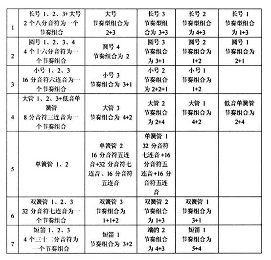 通過(guò)上例我們可以觀察到, 各聲部除了開(kāi)始是一個(gè)二分音符外, 之后的節(jié)奏型主要有四種, 分別為四音組、 三音組、 二音組和一音組, 每個(gè)音組之間用休止符隔開(kāi), 按照不同的樂(lè)器組,由高到低依次遞減。