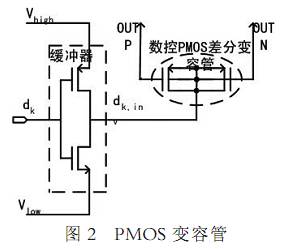 DCO 中的數控變容管一般由兩個連接成差分形式的相同尺寸的PMOS 或 NMOS 管組成 如圖 2 所示 由于 PMOS 處于單獨的 N 阱中