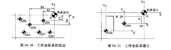 例如,用G54和G59建立兩個坐標系,首先測量出對應工件原點與機床原點的偏置量,即G54 (X1, Y1, Z1)、G59 (X6, Y6, Z6),然后在相應的工件坐標系選擇畫面上填人相應值,就完成了G54 , G59工件坐標系的設定。此后程序中有G90 G54 X30 Y20時,則向預先設定的工件坐標系中的A點移動,如圖14. 11所示。