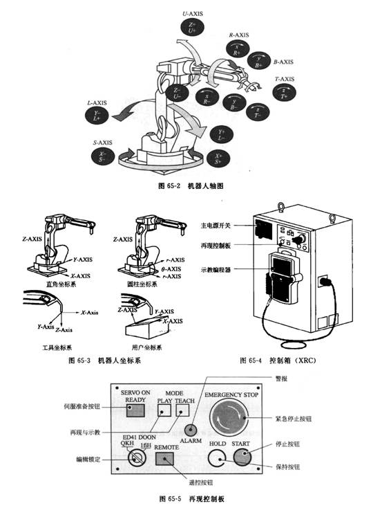 2)控制箱(XRC)機器人要完成的各種操作的控制命令都是由控制箱(XRC)發出的,見圖65-4。其主要由以下部件組成:控制計算機、示教編程器、再現控制板、硬盤和軟盤存儲器、數字和模擬量輸入輸出、打印機接口、傳感器接口、軸控制器、通信接口、網絡接口等。主電源開關閉合則整個機器人系統得電接通。