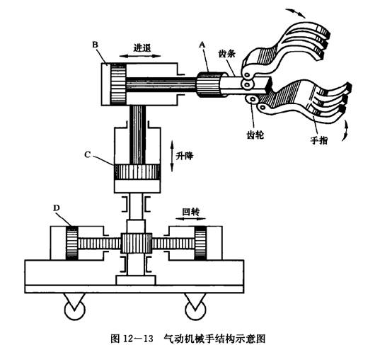 氣動機械手是機械手的一種,它具有結構簡單、重量輕、動作迅速、平穩可靠、不污染工作環境等優點。在要求工作環境潔凈、工作負載較小、自動生產的設備和生產線上應用廣泛,它能按照預定的控制程序動作。圖12一13為一種簡單的可移動式氣動機械手的結構示意圖。它由A、B、C、D四個氣缸組成,能實現手指夾持、手臂伸縮、立柱升降、回轉4個動作。
