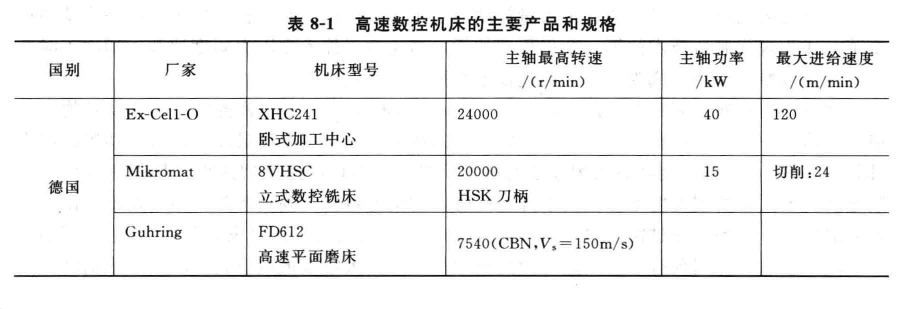 滾珠絲杠的疾速進結速度可達40一60m/mtH,直線電機的疾速進給速度高達90一120m/min。此外,高速機床的主抽和作業臺還要具有杰出的加速度功能,主軸從啟動到最高轉速的時刻只用1—2s,作業臺的加速度到達lf一105。表8—1列出了這些年國際上幾種高速機床的首要產品和標準。