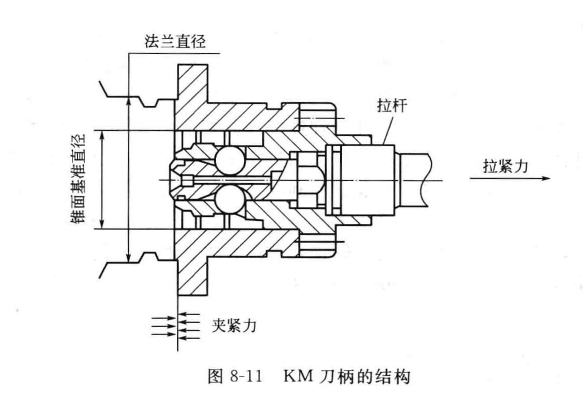 KM刀柄是1987年美國K。nnam碘a1公司與德國w汕a公司聯(lián)合研發(fā)的l,lo短錐空心刀柄(圖8—11),其長度僅為規(guī)范7:24錐柄長度的1/3。因?yàn)楹献麇F度比較短,且刀柄規(guī)劃成中空布局,在拉桿抽向拉力的效果下,短錐可徑向縮短,所以有效地處理了端面與錐面向時(shí)定位而發(fā)作的干與疑問。與HsK的首要區(qū)別是夾緊組織不一樣,它由鎖閉桿波動(dòng)輪和鋼球組成,夾緊時(shí)用鎖閉桿牽引,靠其斜面沿半徑向外推鋼球,使之與刀柄的歪斜孔相觸摸,