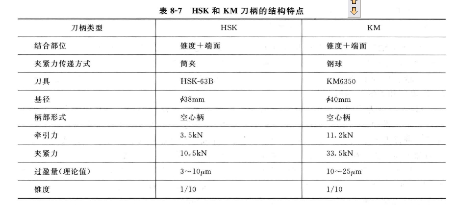o.o01一o.o025mm),具有適應(yīng)高速旋轉(zhuǎn)和換刀時(shí)間短以及固定與旋轉(zhuǎn)刀具通用等長處,為刀具進(jìn)步切削功率和加工質(zhì)量,減少磨損及破損創(chuàng)造了條件。因而,此類刀柄特別合適高速切削加工。德國已將HSK刀柄正式歸入DIN69893標(biāo)ZB,并取得Iso/TC29專業(yè)委員會(huì)的認(rèn)可。HsK與KM作為機(jī)床刀具接口或作為刀具體系模塊的銜接辦法,是機(jī)械加工向高速切削范疇開展不行短少的一套配置體系。表8—7列出了HsK和KM刀柄的布局特色,三種刀柄的布局比較見團(tuán)8—12。