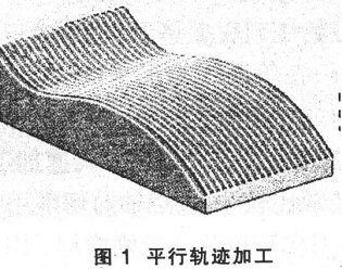 ( 1) 平行軌跡加工( Raster) 。 該類刀具軌跡又稱為掃描行切“Zigzag”類軌跡( 圖 1) 。該類加工策略優點為切削效率高, 計算量小。缺點是對于平行刀具軌跡的陡斜面, 將得到 Z向間隔很大的刀具軌跡, 加工質量不高, 對此可以通過調整刀具軌跡擺放角度或采用補充垂直路徑的方法加以修正。