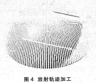 ( 4) 放射軌跡加工 ( 圖 4) 。放射狀加工( Radial) 策略通常用于對稱且加工紋理有特殊要求的場合, 它在靠近中心的位置刀具軌跡密集重疊, 故對于刀具軌跡延伸至中心的模型, 其加工效率不高, 其總體加工時間比采用平行加工策略約多出 20%~30%, 故只用于如球面、 環形圓弧面區域等對于刀具加工紋路有特殊要求的加工區域。