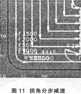 在數控高速切削加工中, 刀具軌跡拐角的處理是十分重要的, 因為即使切削深度很淺, 進給速度和走刀軌跡的劇烈變化也是造成刀具破損的重要原因之一。 為避免這種情況, 應調整進給速度, 從而調整每一個刀刃的切削量( 圖 11) , 在圖中的拐角處, UG NX3.0 采用了分步減速的方法。同時要避免刀具軌跡的劇烈變化( 圖 12) , 圖中的圓角如果用等半徑的刀具直接加工, 如圖 4- 12 ( a) 所示, 則進給方向發生突變勢必會使機床負荷猛然增加, 所以, 加工這種類型的圓倒角最好是使用較小半徑的刀具, 一般情況下刀具半徑最好為圓倒角幾何尺寸的 70%或更小, 這樣可使拐角處的切削刀具進給方向變化平滑, 避免刀具的突然轉向, 見圖 4- 12b) 。使用小直徑刀具加工和直接切入拐角相比,機床負荷可以降低 3 倍左右。